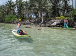 Most starfish eat mollusks. Some eat sponges or plankton. The Crown of Thorns starfish (COTs for short or Alamea in Samoan) actually eat the reef. They are for some reason out-of-balance in the ecosystem at outbreak levels and are destroying the reef in many areas. There has been an ongoing effort by several agencies here to kill them and preserve the reef. They have a very painful sting if you touch them! My neighbor Kelley goes out regularly to remove them from the reef in front of our houses at Coconut Point. This day we were actually just paddling and snorkeling, but Sabrina found this large COT and we felt the need to remove him. The coral dies and turns white in the areas where the COT has been attacking it, so generally you find them by looking for white (dead) areas in the reef.