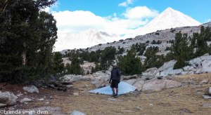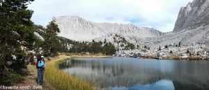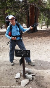 Tim and I have 9 days, and it only takes 4 or so to finish the rest of the JMT, so we ask for recommendations for side trails. Tim asks Strider to help him with the map and compass since she is well known for hiking all these trails. He and I have had a conversation or two about declination (which means he is pointing to what he thinks is north, and I am pointing about 25 degrees to his left using the sun at the equinox as my guide!)… Strider: “Declination? Hmmm. Well, (as she points North) North is that way because that is where my mom lives.” HA HA HA HA!!!! Tim is so frustrated. He just gives up and puts away the compass, knowing it is useless and thinking that girls will always gang up on him. Anyway, Strider gave us her recommendation for where to spend our extra days: Lake South America and the surrounding area. Excellent. And we’re off again, heading up and up for 5 1/2 miles and 2600 feet of elevation gain to 11,845 feet at Kearsarge Pass.