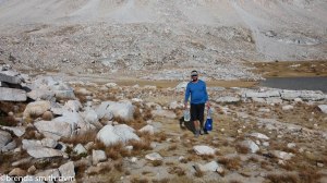 So we got a late start around 11:30. We had a beautiful walk down the lake valleys. The weather had cleared to nice blue sky. We had planned to move camp to a lower lake and explore another canyon and lake system, but about 2 hours into our walk Tim realized the date. We added up the miles and decided that we really needed to start making our way towards Mt Whitney. So down, up, down, up, and looking for the lowest lake where we could meet up with the trail. We found the loop trail and — Eric! He is from LA and was hiking the loop with a really empty, small pack. We were too surprised to see him to think to ask how, since we are at least 3 days from any town.