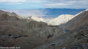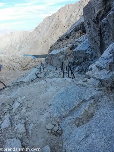 At the trail junction (five hours after starting), we left most of our gear. There are lots of left items: poop bags, clothing, and supplies. I want to hope that most people will pick it back up and pack it out like we will… The actual 2 mile trail to the summit is exposed, but fairly easy. It is like a highway compared to our last few weeks ~ we crossed paths with at least 30 people of all ages. It is an interesting assortment. Some people hike it after weeks on the trail, like Tim and me. Others take 3 days and set up a base camp on the Whitney Portal side. Some day-hike it, all 22 miles!