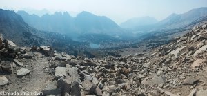 As we (finally) reach the pass, smoke is coming up from the north and the south. We can smell it, see it, and Tim starts to cough as he finds it irritating. We head down the other side of the pass to find a campsite at Kearsarge Lakes. Tim is really tired, and I have to convince him to eat dinner. I fall asleep by 6, and apparently Tim gave me Tums in my sleep. He read for about an hour, and was asleep as well by 7 pm!