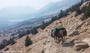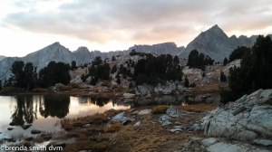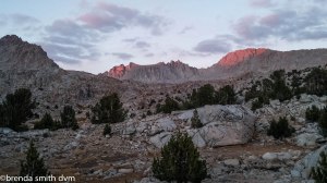 The day after being sick is never a good day to hike. We saw a few others who had camped around the Kearsarge Lakes. We tried to meet up with the JMT by shortcutting around the end of the Kearsarge Pinnacles, but I was so dizzy and weak that we had to abort and just take the trail near Bullfrog Lake. I struggled all day, feeling depressed and insecure and near tears. Feeling poorly can make me emotionally fragile I guess. We had a snack at Vidette Creek, and I felt a little better. We keep heading up about 5 more miles to get close to the next pass. The cascading waterfalls are pretty and sound lovely. We did not see a soul on the trail until late in the day – when we met a couple who told us they were unprepared and were going back out. The girl had a huge pack, and was carrying a water bottle and her hat in her hand. She told me she was just so exhausted! We have no idea why they passed a bunch of campsites to go further down so late in the day, but maybe they just wanted to be at a lower elevation. We set up camp at a heavily used site along the trail. There were waterfalls across the valley. We were treated to lovely pink sky colors at dusk. We could see smoke again to the north, but none further south where we were heading.