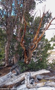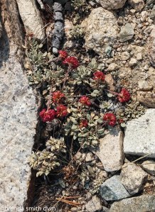 Sunrise gave pretty pink color to the mountains. Tim hadn’t slept well, so was crashed until around 8. He thinks we’ll find 3 more tent stakes before we are finished with our trip, so he searches for one that I had seen but been unable to pull out the day before. Two hikers passed our camp before we were packed up. One was a red-haired girl that we had seen several times around the Thousand Island Lake area two weeks previously. Once we are up and walking, we see a lake only a short distance up where we could have camped instead! Oh well, not much to do if it is too small to make the map. We start our climb up the pass: Forester Pass at 13,180 feet which will be our highest so far. Luckily I am feeling much better today. As we walk, we realize that the flat mesa-type area we were looking at the night before is actually the trail to the pass… yikes! We find beautiful alpine lakes and very interesting and colorful veins in the cliffs. About a zillion switchbacks provide stunning views and we can see and hear pikas everywhere. We can still see a bit of smoke to the north, and are very glad that we made the decision to skip the fire area. The tops of the peaks are stunning and colorful above the glacial valley.