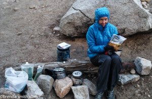 We enjoyed nice sunset colors once more, then snuggled into our bags to plan our route for the following days. Thinking about the day and the hiking, I realized that I had been strong all day but at the same time had been zoning out and having tunnel vision most of the day. I think it is from the elevation. It is a very weird feeling! Tim doesn’t experience anything like it, and feels strong and normal all the time. Huh.