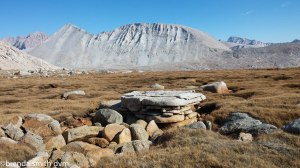 Heading down the south side of the pass, the trail work is amazing. Basically, the trail has been built out of broken up boulders, complete with retaining areas and bridges and huge metal stakes to hold it in place. The top section was exposed and vertical enough to be scary! The whole horse-falling-off-a-cliff thing has done nothing good for my comfort level with heights. (But that is a story I’ll write down some other time…) The valley is quite barren but has nice big lakes. We stop at the base to filter water and have a snack. There is a very sleepy marmot who let me take some close pics without caring at all. (And also without begging for food, so at least that is good. Hopefully I’m just sneaky and he isn’t that tame!) We headed down along a creek, then headed cross-country towards Lake South America. Tim says: “watch out for the holes full of rocks”. Which seems silly until you realize that there are actually big holes all over the place that are full of rocks and small boulders. It is a drainage or flood plain of sorts, and pretty odd. We came to a scree field and could see the trail up to Lake SA across a series of cliffs. Since there was a lake at the bottom and it was getting late, we set up camp at the lower lake. The sun was still warm and we had nice baths in the lake (Tim) or by the lake (me). As we were setting up camp, two guys headed down and reported that the area above was stunning! They had been climbing a few peaks in the area and were hiking back out.