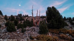 We found a lake with trees, deer, squirrels, chipmunks, and lots of meadowlarks for our campsite. We found tent stake #2 of Tim’s 3 in camp. The sunset was amazing with beautiful colors, reflections of the mountains in the lake, and the risen moon. We felt like all was well. We saw NO people all day. We love our campsite, and plan to leave it as base camp for the next day to explore the lake valleys nearby.
