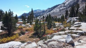Hiking without a pack is AWESOME!! I can jump between rocks again! We battened down our tarp before leaving in case of a storm, and Tim is carrying water and snacks and first aid and such for both of us. We hike in the valley and around the lakes below Mt Jordan and Mt Genevra. There are heavy clouds in the morning, but it is a nice chilly day for wandering and exploring the area which is SPECTACULAR!! We have autumn colors in the trees and brush, and nice rocks of all different colors. It was a good almost-rest day of walking and snacking and goofing off a bit.