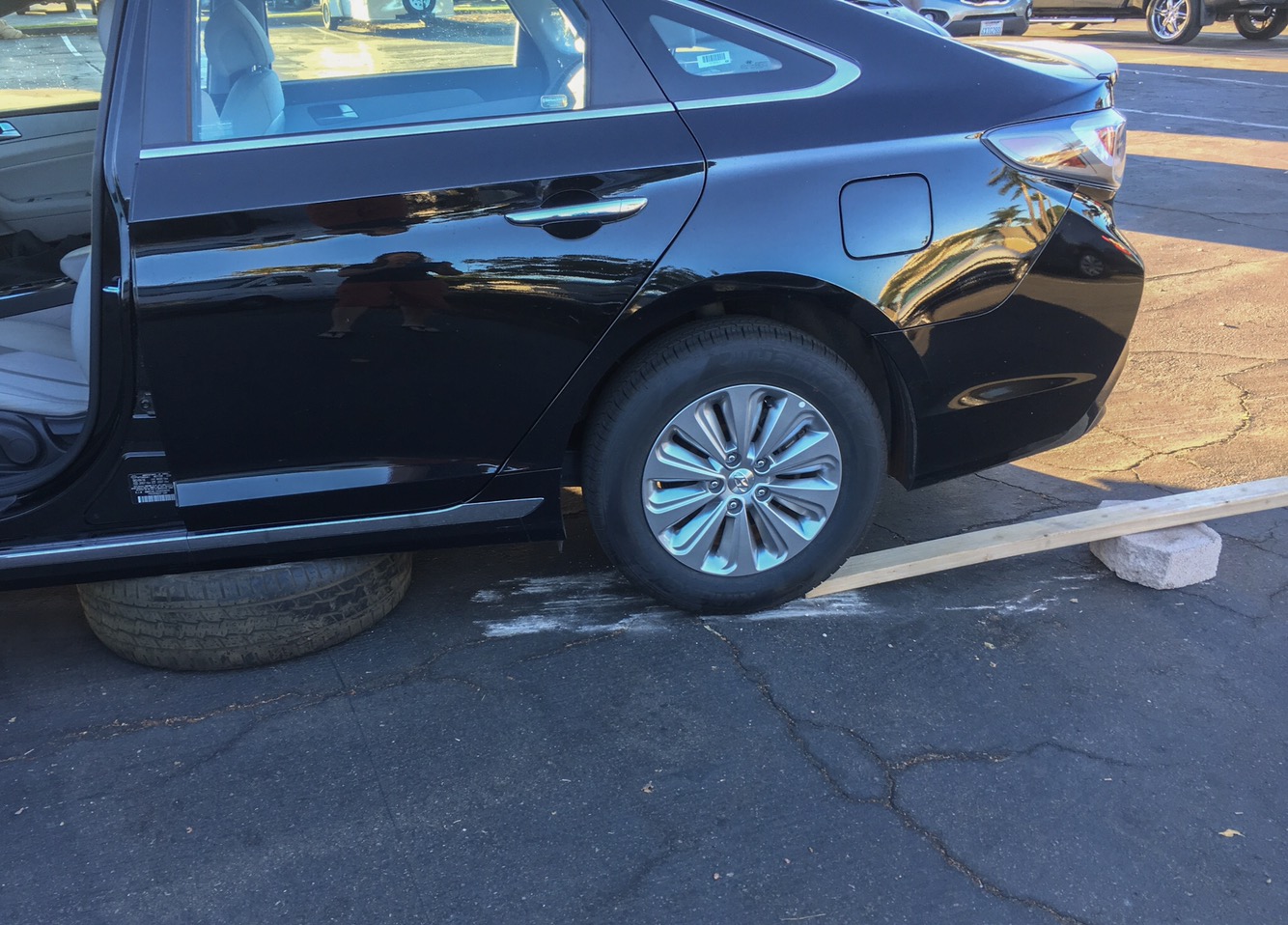 Apparently someone left a wheel in the parking space in front of me which I couldn’t see from inside the car. I vaguely remembered seeing it in the lot the night before, but not in front of me. Now this wheel is wedged under the doors and I can’t back up or go forward. Guess I’m going to be late again.