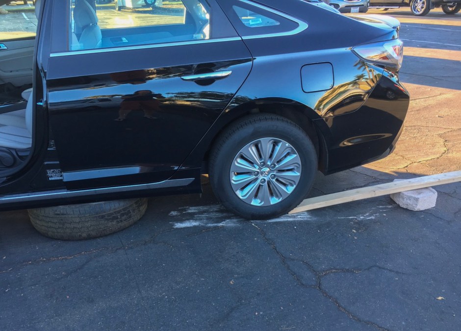The next morning as I’m leaving the parking space, the car feels weird. Flat tire? I didn’t notice one. I turn up the aisle and am met with terrible crumpling sounds and the car basically stops. What the??