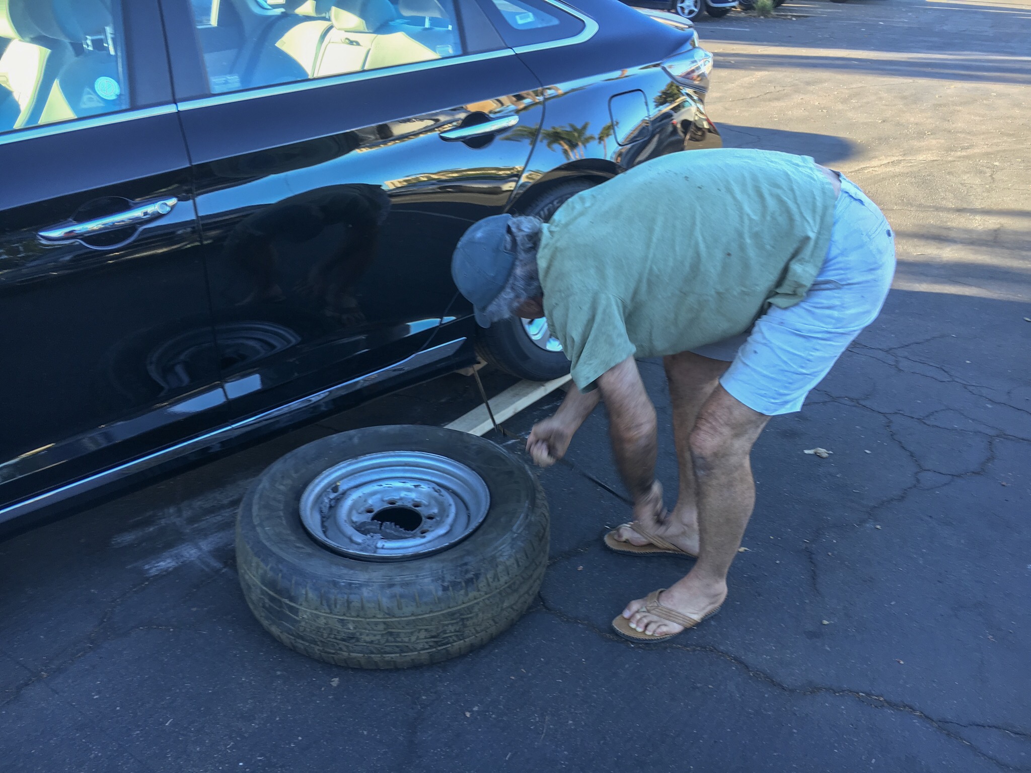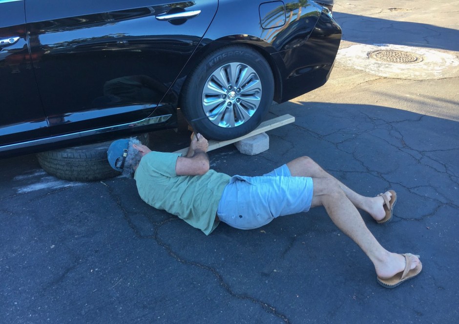 My ramp wasn’t high enough, and the car doesn’t seem to have a jack. Or a spare tire for that matter, just some inflatable thing. When I see a work truck start to pull out and leave, I flag the guy down to see if he has another board or a hydraulic jack or something I can use. He looked at me like I was nuts, but at least came over to see what was going on. ‘Well, I’ve never seen that before!’ No, me neither. He was a gem and found a jack from another vehicle and proceeded to actually help me!!